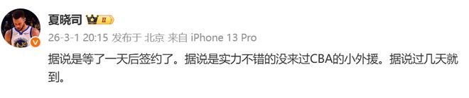 当然为什么夏晓司说的这么谨慎,他在评论区的时候也强调过:不上飞机,不敢说确定了。毕竟他怕有变动。反正这样的动态就证明一个点,这个外援基本上板上钉钉了,但就是没有公布到底是谁。